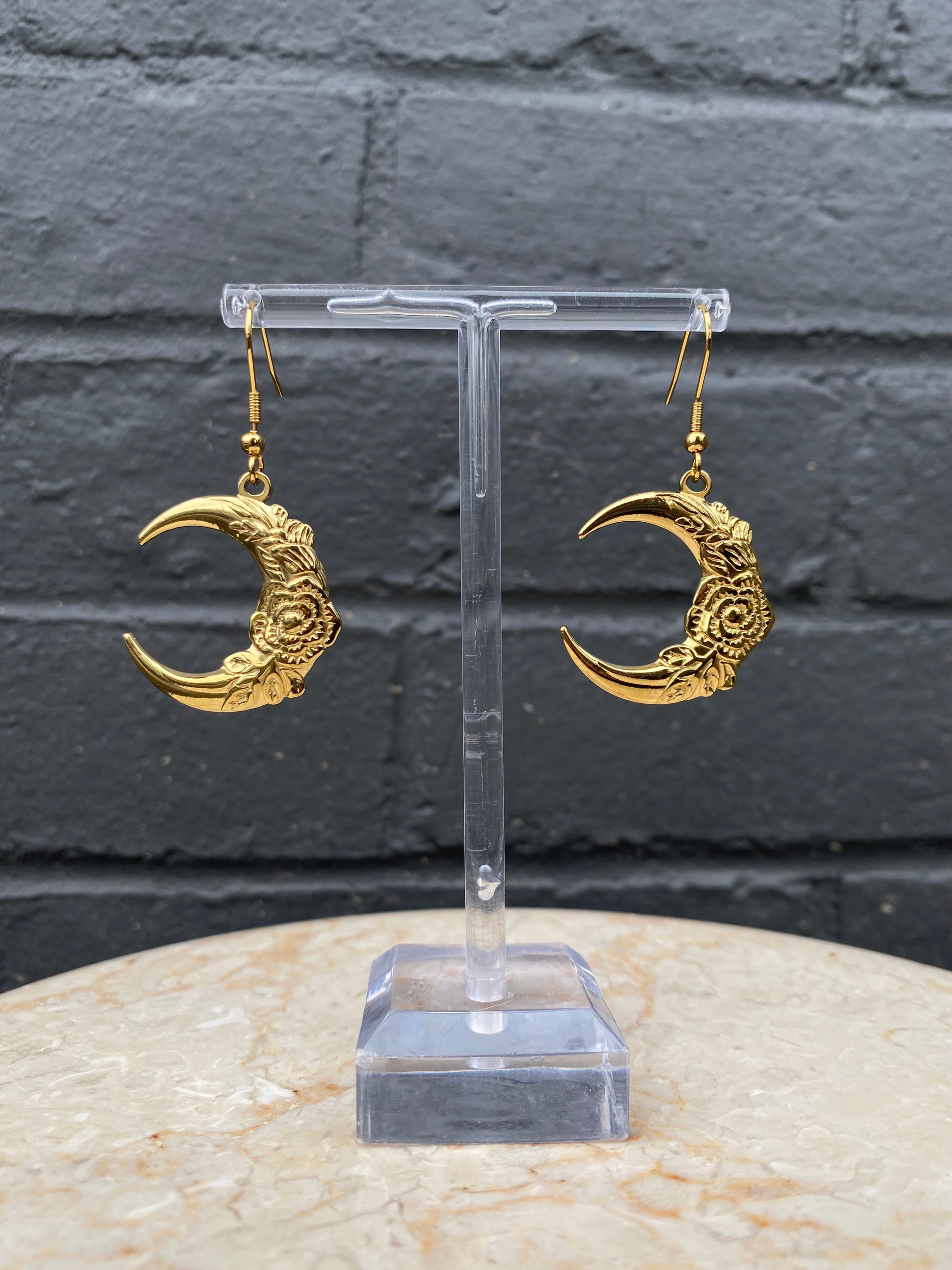 Stainless steel moon earrings with flower details. Pick from three different colors