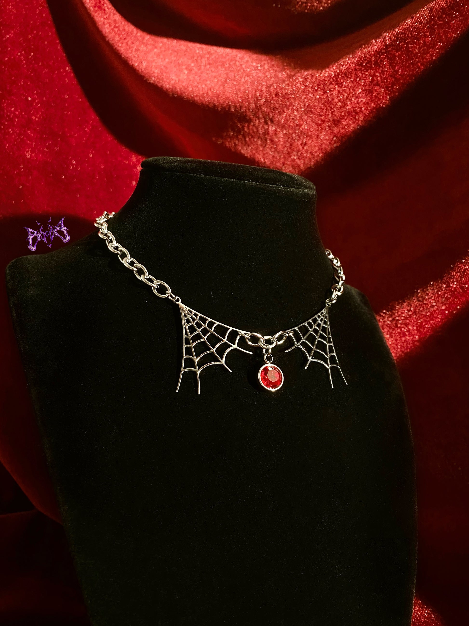 Choker with stainless steel web charms and a stainless steel red gemstone charm. Chokers are typically 15 inches in length, but message me after buying if you would like it shorter or longer than that!